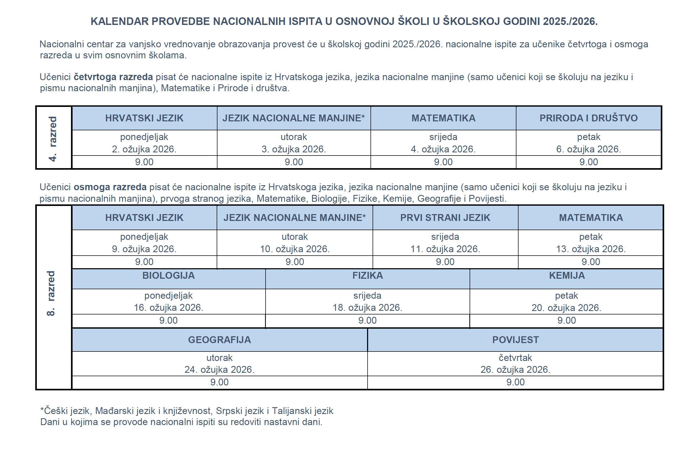 Nacionalni centar za vanjsko vrednovanje obrazovanja provest će u školskoj godini 2025./2026. nacionalne ispite za učenike četvrtoga i osmoga razreda u svim osnovnim školama Republike Hrvatske. U ponedjeljak, 2. ožujka počinje njihova provedba i trajat će do 26. travnja 2026. godine.