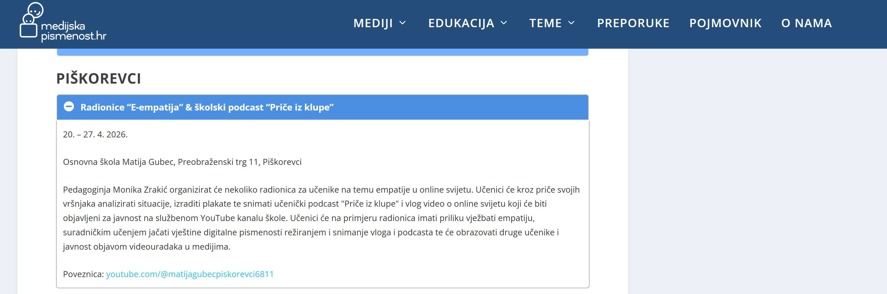 Ove godine održavaju se 9. Dani medijske pismenosti od 20. do 26. travnja 2026. s fokusom na empatiju u digitalnom okruženju, kao prevencija i odgovor na online nasilje. Aktivnosti koje provodimo u našoj školi službeno su uvrštene u raspored događanja Dana medijske pismenosti 2026., a provodi ih školska pedagoginja Monika Zrakić u sklopu A2 programa, B1 izvannastavnih aktivnosti i rekreacijske pauze.